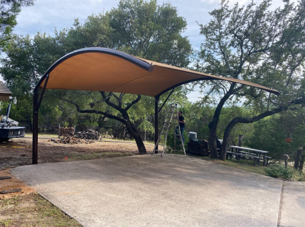 - Footings and anchors are sized to the structure. A small patio canopy and a 10-post dealership lot cover have very different load requirements. We calculate footing depth and anchor diameter based on the span, the fabric tension load, and the soil conditions at your specific site. Expansive clay soils common in parts of the Hill Country need a different footing spec than sandy or caliche-heavy ground closer to the IH-35 corridor.